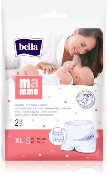 BELLA Mamma Basic, 2 db, Szülés utáni alsóneműk nőknek, A szülést követő napokban a hagyományos bugyi kényelmetlen viselet lehet. Legyen felkészült, és a kórházi csomagban helyezzen el BELLA Mamma Basic szülés utáni alsóneműt is, amely biztosítja a teljes körű kényelmet, ráadásul maximálisan higiénikus. Tulajdonságok: frissen szült nők számára nagyon erősen rögzíti a szülés utáni tisztasági betétet rugalmas anyag könnyű és puha anyag mosható sehol sem nyom vagy szorít Használata: A használatot követően mosógépben mossa ki a bugyit. Használja szükség szerint a maximális szülés utáni higiénia biztosítására.