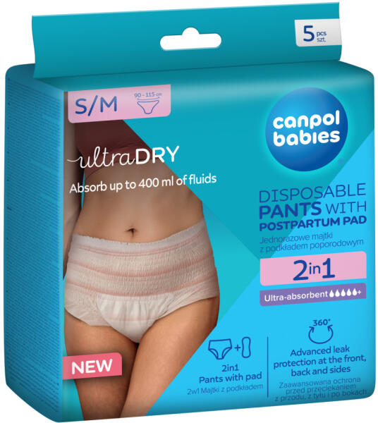 A Canpol babies 2 az 1-ben eldobható, belső betétes szülés utáni bugyi az ultra nedvszívó szülés utáni betét és a légáteresztő bugyi kivételes kombinációja, amely a legmagasabb szintű védelmet és kényelmet nyújtja a szülés utáni első napokban.