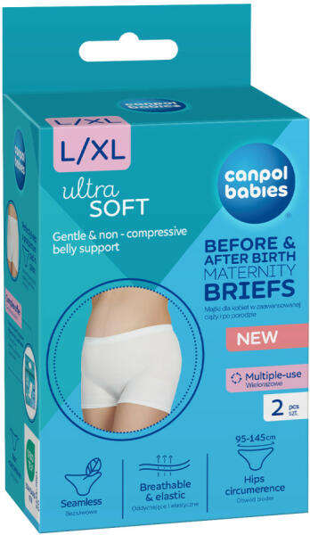 Puha és nagyon rugalmas – remekül illeszkedik a pocak formájához, nem szorít, így tökéletes a terhesség alatt és a szülés után. Dörzsölődés nélkül támasztja meg a hasat. Nem irritálja a bőrt és biztosítja a szabad légáramlást. Diszkrét, láthatatlan a ruhák alatt, egész napos kényelmet biztosít. A Canpol Babies anyukáknak tervezett bugyija tökéletesen a helyén tartja a szülés utáni betétet. A megfelelő szülés utáni fehérnemű megkönnyíti és felgyorsítja a sebek gyógyulását, mind a természetes szülés, mind a császármetszés után. A bugyi magas dereka kíméletes a császármetszés okozta heghez. A bugyi többször használható, kézzel és mosógépben is mosható. A csomag 2 darabot tartalmaz. Az L/XL méret kb. 95-145 cm közötti csípőkerülettel rendelkező nők számára alkalmas. A bugyi OEKO-TEX minőségi tanúsítvánnyal rendelkezik. Az OEKO-TEX® Standard 100 tanúsítvány garantálja a bőrrel közvetlenül érintkező textiltermékek biztonságosságát és a ruhaipari gyártásban használt káros kémiai anyagokat nem tartalmazza olyan mértékben, ami negatív hatással lehet az emberi egészségre és a környezetre, értve ezek alatt például: peszticidek, klórfenolok, formaldehid, allergén színezékek. Fontos! A termék egészségvédelmi és higiéniai terméknek minősül. Amennyiben a csomagolás felbontásra került, vagy a kipróbálás jelei látszódnak a terméken, úgy a 14 napos elállási jog érvényét veszíti a 45/2014. (II. 26. ) korm. rendelet 29. § (1) bekezdése alapján.